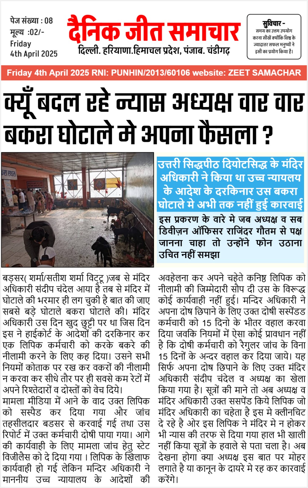 इसी पर आज सेवी दविंदर सिंह ने कहा बावा बालक नाथ जी मे अगर बकरा घोटाले मे असल दोषी के खिलाफ कारवाई नहीं करेंगे उच्च अधिकारी तो हम माननीय उच्चन्यालय मे केस करेंगे ओर दोषी के खिलाफ कारवाई करायँगे जिस ने उच्च न्यालय के आदेशों की अबेहलना की ओर जो उच्चअधिकारी इस का साथ दे रहे उनको भी कोर्ट मे जवाब देना होगा।