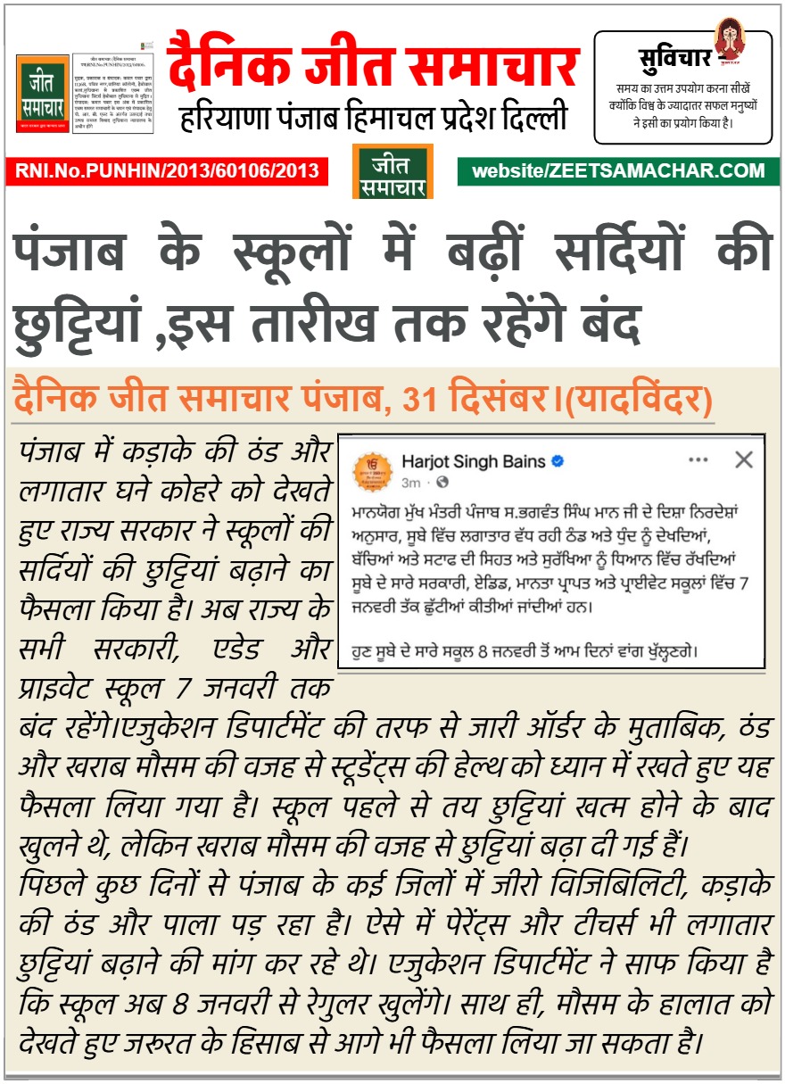 पंजाब के स्कूलों में बढ़ीं सर्दियों की छुट्टियां ,इस तारीख तक रहेंगे बंद