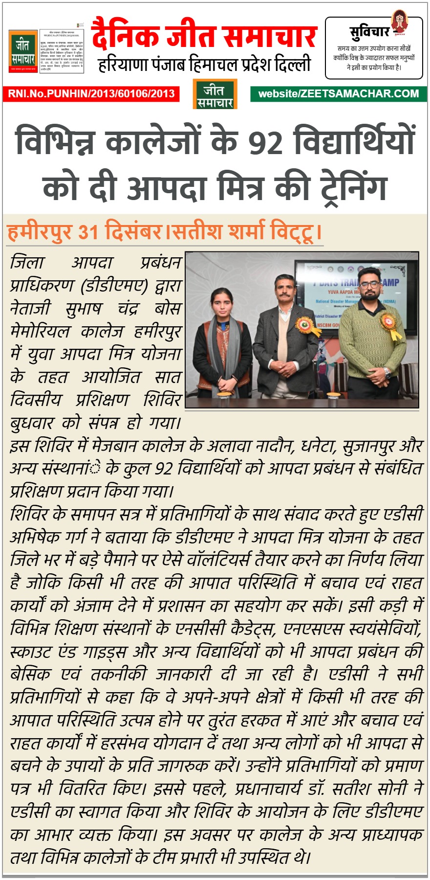 विभिन्न कालेजों के 92 विद्यार्थियों को दी आपदा मित्र की ट्रेनिंग