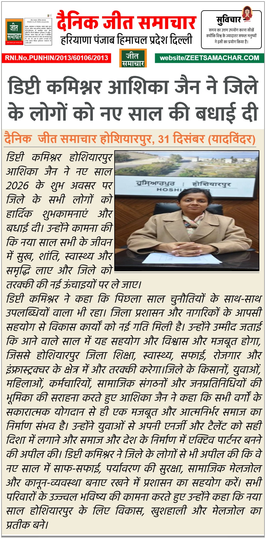 डिप्टी कमिश्नर आशिका जैन ने जिले के लोगों को नए साल की बधाई दी