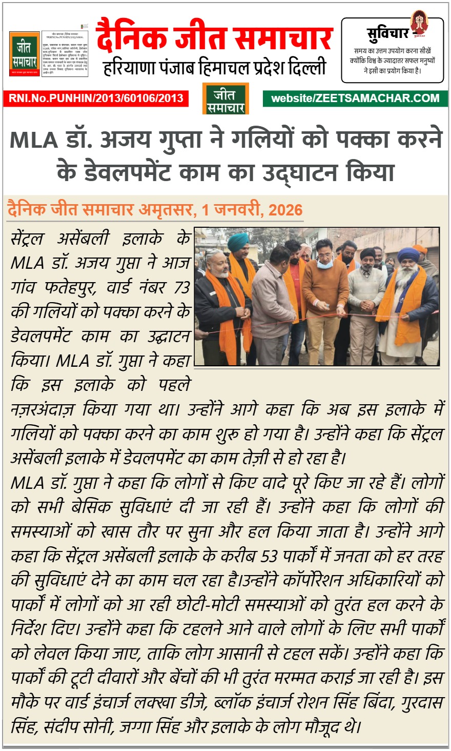 MLA डॉ. अजय गुप्ता ने गलियों को पक्का करने के डेवलपमेंट काम का उद्घाटन किया