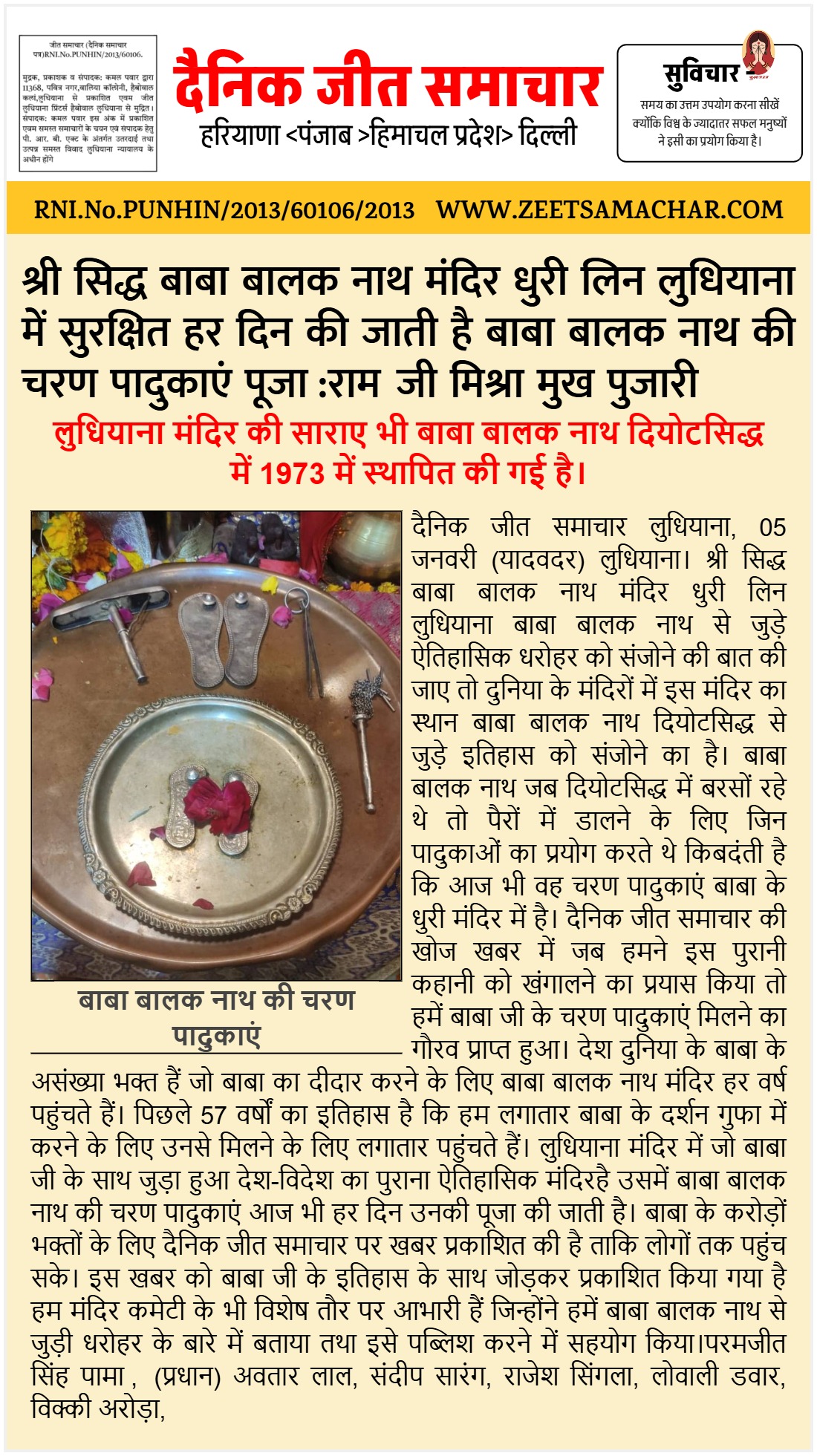 श्री सिद्ध बाबा बालक नाथ मंदिर धुरी लिन लुधियाना में सुरक्षित हर दिन की जाती है बाबा बालक नाथ की चरण पादुकाएं पूजा :राम जी मिश्रा मुख पुजारी