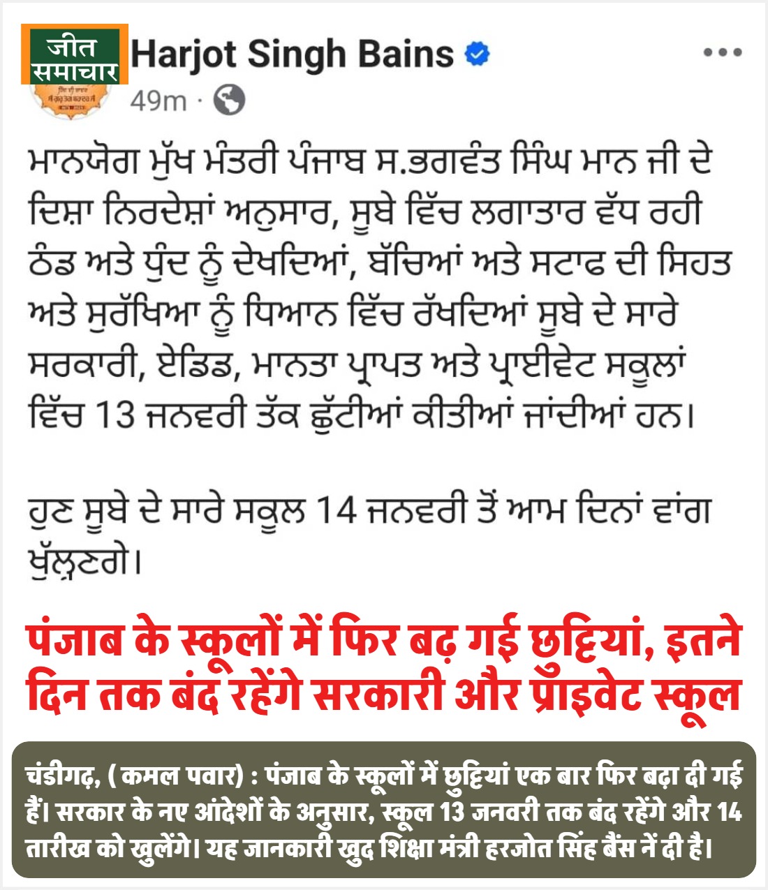 पंजाब के स्कूलों में फिर बढ़ गई छुट्टियां, इतने दिन तक बंद रहेंगे सरकारी और प्राइवेट स्कूल