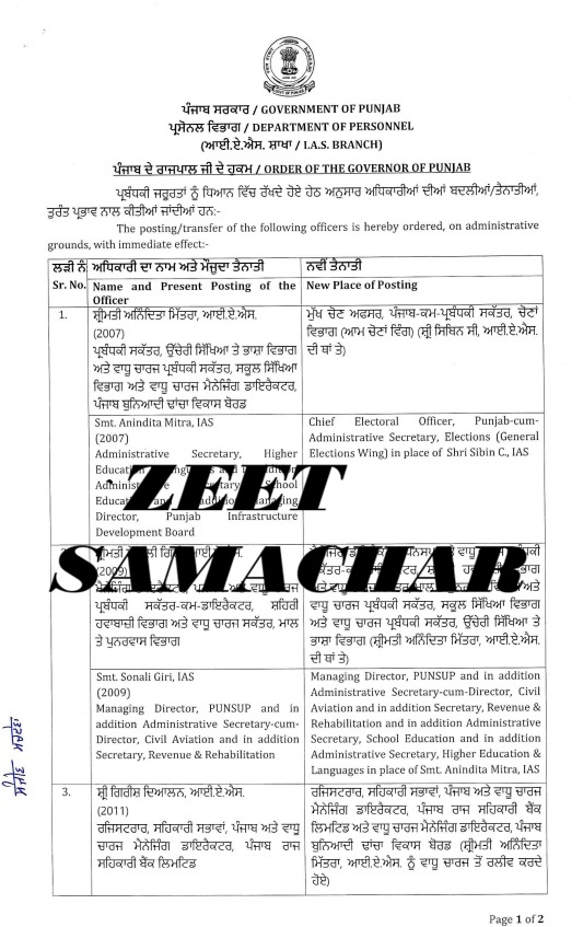पंजाब सरकार द्वारा आई.ए.एस. अधिकारियों के तबादले किए गए हैं। बता दें कि 3 आई.ए.एस. अधिकारियों के तबादले किए गए हैं। इस दौरान अनिंदिता मित्रा को पंजाब की मुख्य चुनाव अफसर नियुक्त किया गया है। इन आदेशों को तुरंत प्रभाव से लागू किया गया है। जिन अधिकारियों के तबादले किए गए हैं उनकी सूची निम्न है।