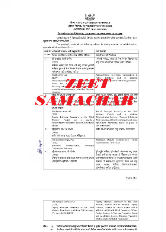 पंजाब सरकार ट्रांसफर: पंजाब में अधिकारियों के ट्रांसफर और पोस्टिंग, देखें लिस्ट